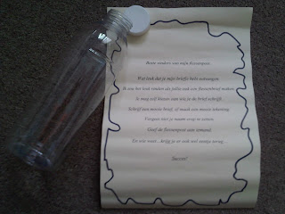 Na het verhaal viel opeens de fles aan mijn trolley op: “Juf, jij hebt ook flessenpost!”. Dus heb ik nog even een korte uitleg gegeven over flessenpost nu en vroeger en toen snel de fles geopend en de brief voorgelezen. Er stond in dat de schrijver van de brief het leuk zou vinden als de kinderen ook een fles met een brief erin zouden maken. “Dan moeten we flessen sparen!”, was gelijk de eerste reactie. Gelukkig hoefden we daar niet op te wachten, want de trolley die ik had meegenomen zat vol met flessen.